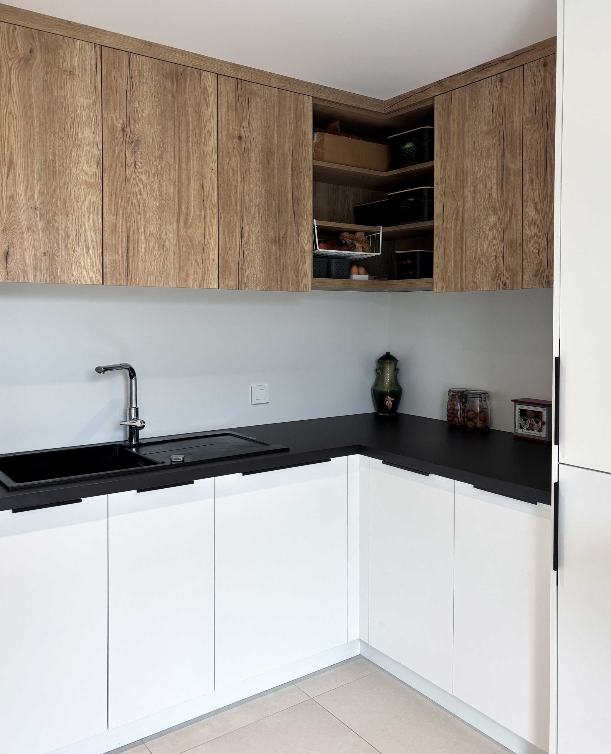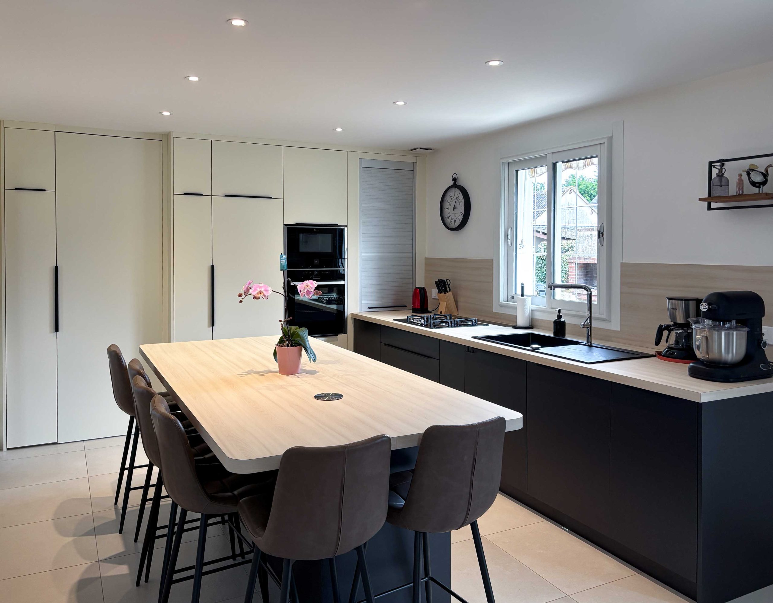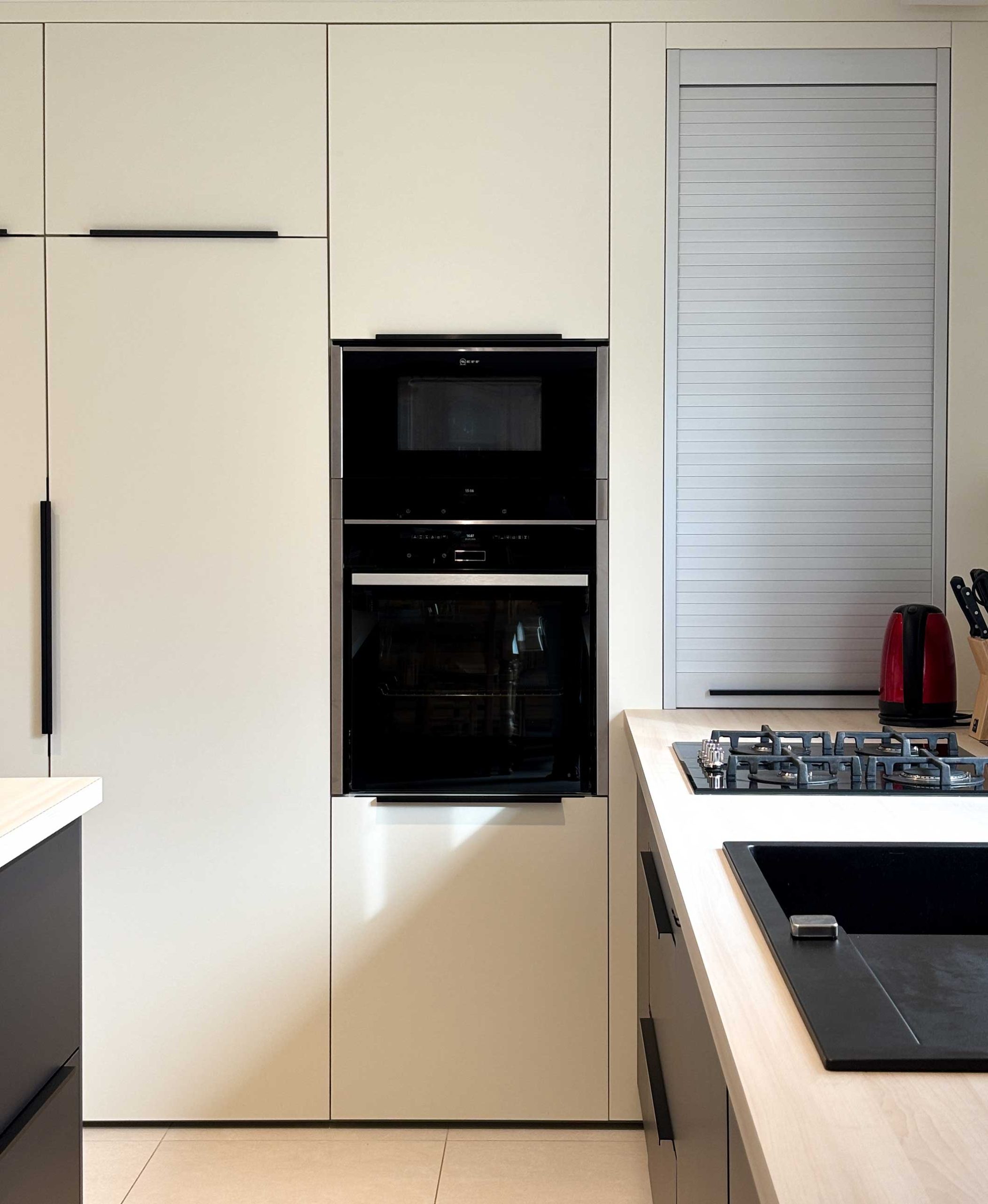 Découvrez cette cuisine de notre gamme standard, entièrement équipée d’une hotte escamotable et de nombreux rangements.