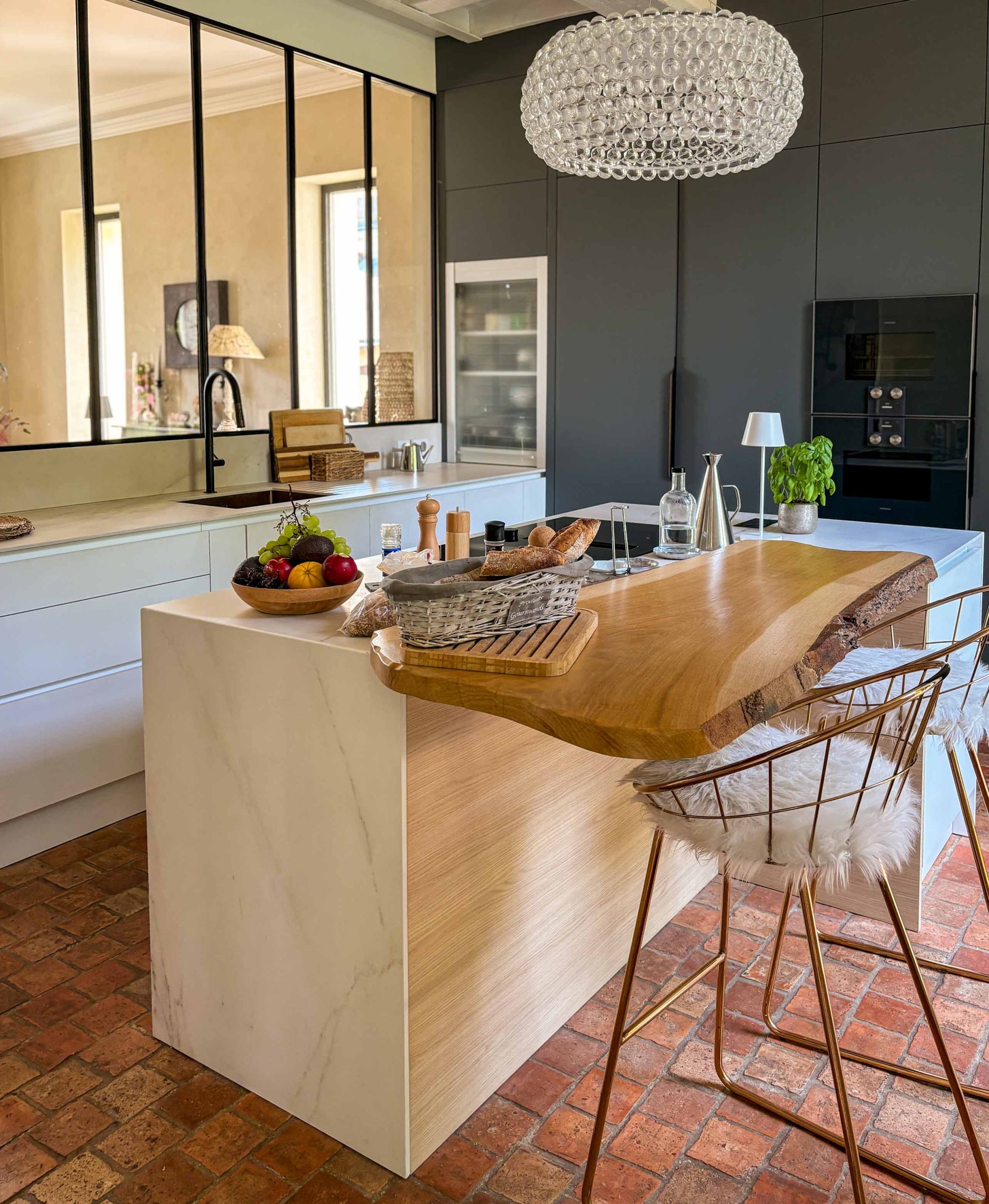 Pour moderniser l’espace, nous avons harmonisé les volumes, intégré l’électroménager, et créé un bel espace plan de travail, îlot central. Le choix des couleurs et des matériaux complètent le plan de travail en céramique.