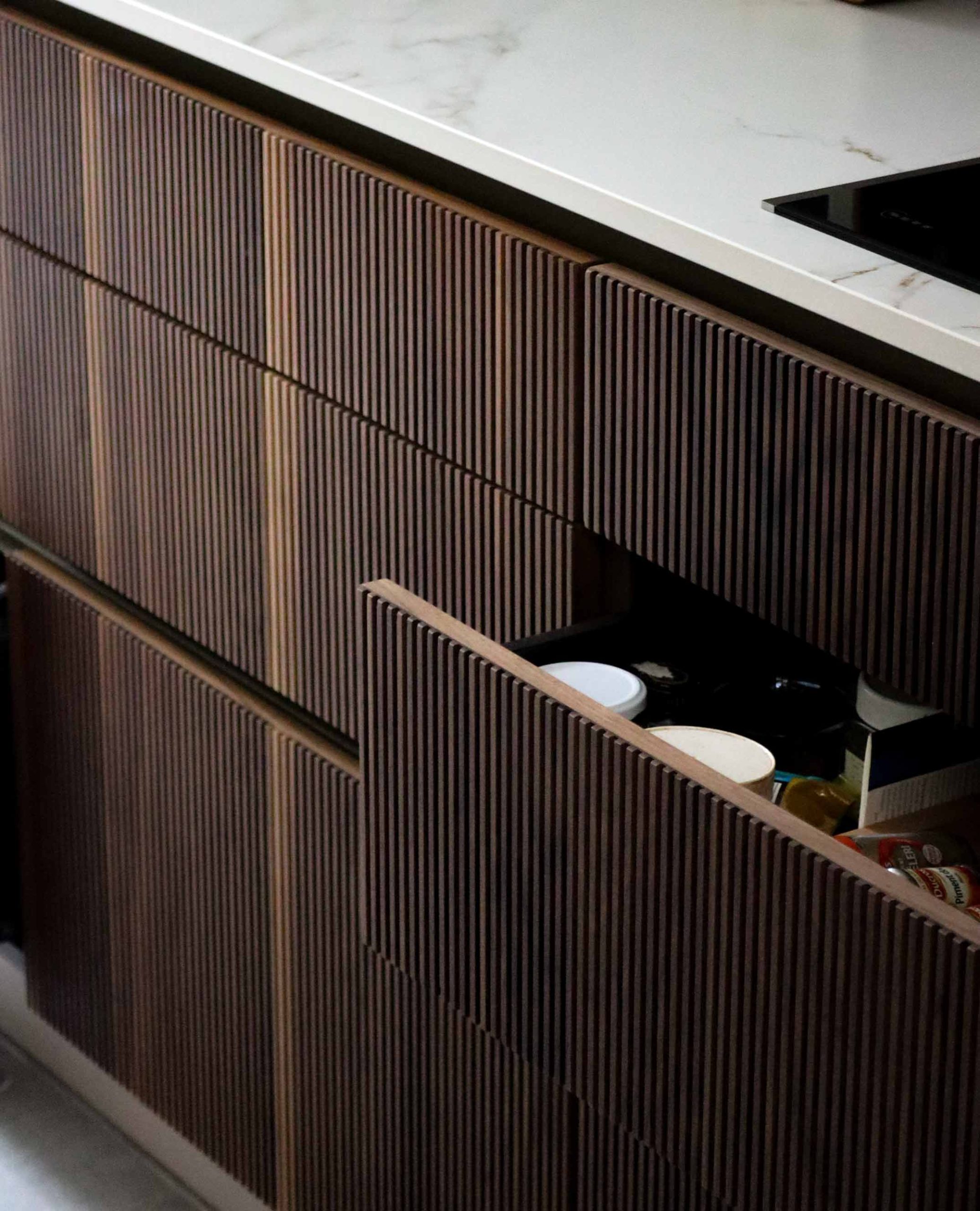 Cette cuisine sur-mesure allie le raffinement du marbre blanc à la chaleur du bois foncé. Les panneaux fraisés apportent un subtil contraste, créant un espace à la fois moderne et sophistiqué, parfaitement adapté à cette intérieur.