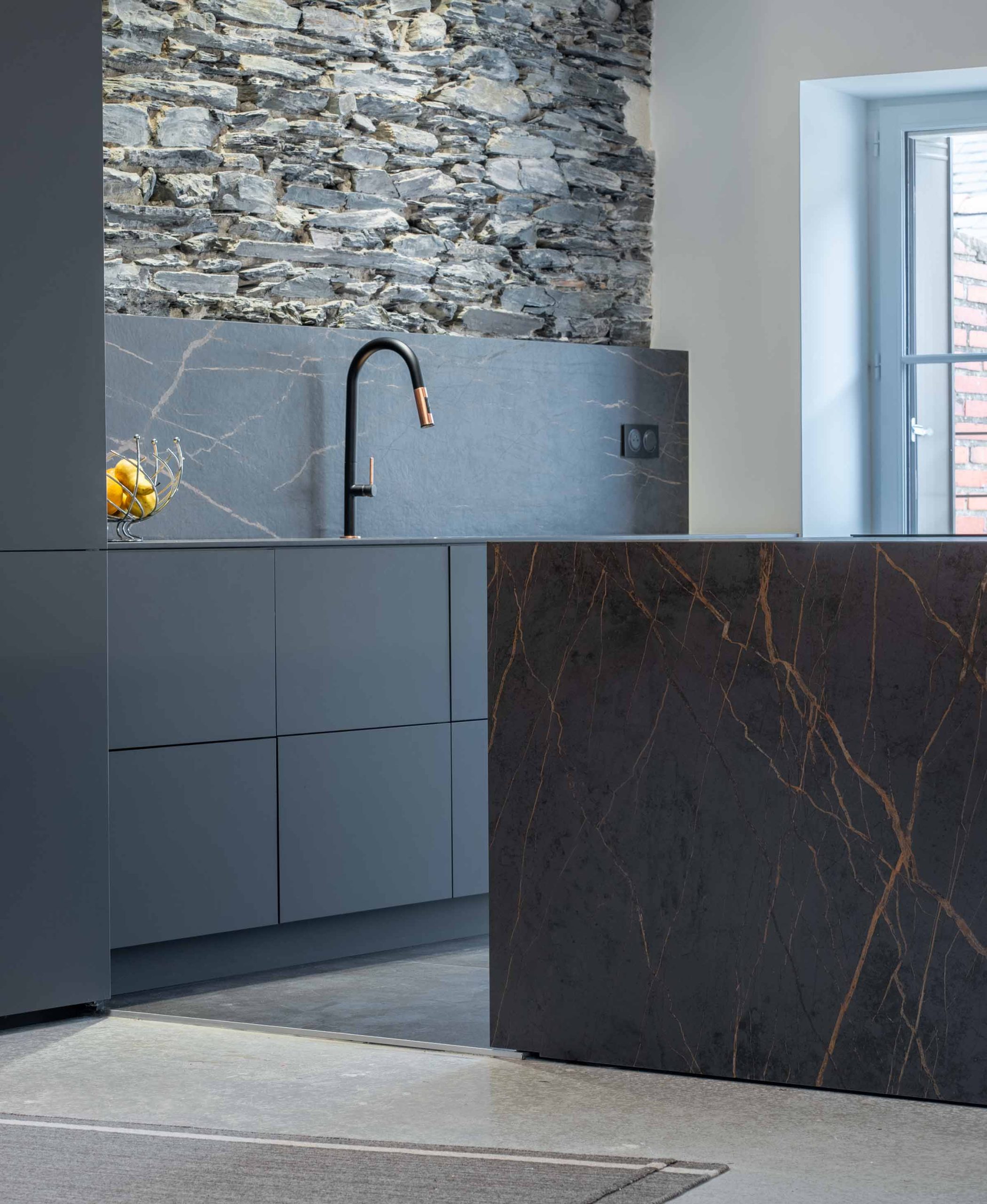 Le plan de travail est quant à lui en pierre de Matria ainsi que l’évier.